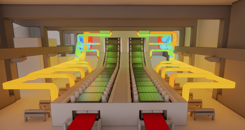 Um die Herausforderungen im Zusammenhang mit industriellen Schwaden zu meistern, wird heute ein Ansatz bevorzugt, der Messungen vor Ort (über ein Audit) mit der numerischen Modellierung der Strömungen (CFD – Computational Fluid Dynamics) kombiniert. Die CFD liefert eine dreidimensionale und dynamische Sicht der Strömungen, die unerlässlich ist, um die kritischen Bereiche der Wärme- und Dampfansammlung, die Rezirkulation der Luft, die Defizite bei der Erfassung an der Quelle und die Wechselwirkungen zwischen Wärmefahnen und Lüftungssystemen genau zu identifizieren. Sie ermöglicht es, die Wirksamkeit bestehender Systeme quantitativ zu bewerten und ihre Grenzen unter realen Betriebsbedingungen zu verstehen.