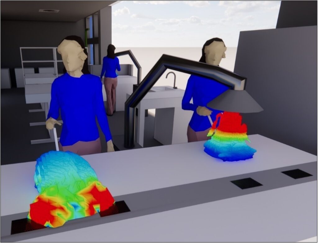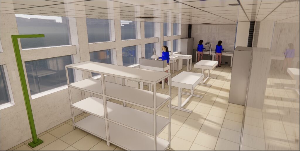 Die resultierende3D-Umgebung stellt eine realistische Darstellung des Labors dar, die den aktuellen Nutzungsbedingungen entspricht. Diese Genauigkeit ermöglicht es,die tatsächlichen Luftströme und die komplexen Interaktionen zwischen Emissionsquellen, physikalischen Hindernissen und Belüftungssystemen zuantizipieren.
