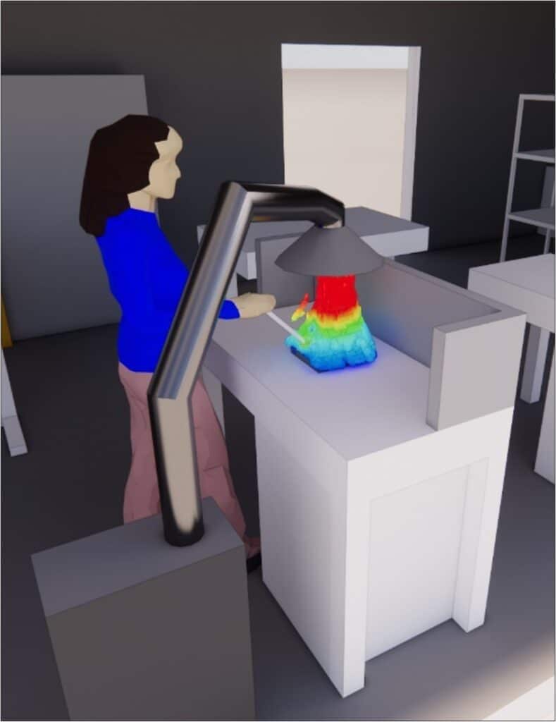Um das Emissionsszenario genau zu reproduzieren, wurde an jedem Arbeitsplatz ein Schlagstift mit einer kontinuierlichen Blasgeschwindigkeit von 1 m/s auf der Höhe der Fossilien modelliert. Diese Vorrichtung simuliert die Staubentwicklung bei der mechanischen Bearbeitung der Stücke.