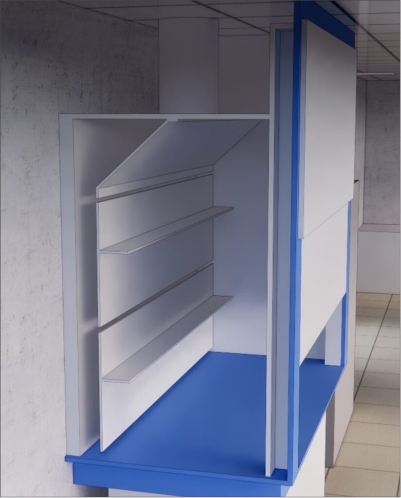 In einer ersten Konfiguration ist das Labor ohne mobile Absauganlage dargestellt, nur mit Wandabzugsgittern ausgestattet. Diese Situation entspricht demursprünglichen Zustand vor der Hinzufügung der gezielten Aufnahmevorrichtungen.