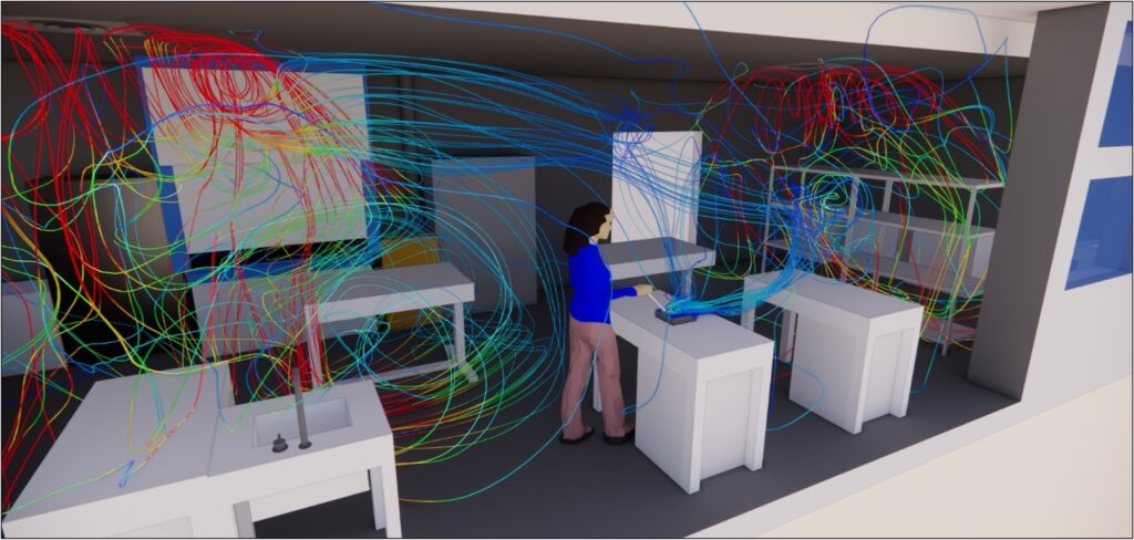 In diesem Zusammenhang ist die von EOLIOS durchgeführte Studie zu sehen. Sie basiert auf der Verwendung der numerischen Simulation der Strömungsmechanik (CFD) zur Analyse, Quantifizierung und Visualisierung von Partikelverteilungsphänomenen im Geologielabor.