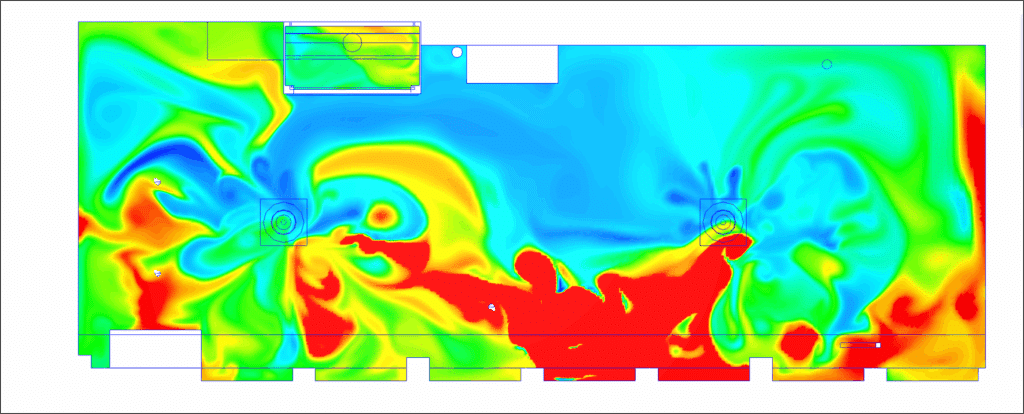 - Die Geschwindigkeitsschnitte zeigen die Dynamik der Strömungen, die von den Diffusoren, den Aufnahmesystemen und den Öffnungen erzeugt werden.