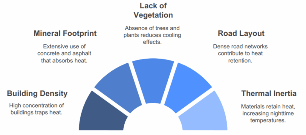 Städtische Hitzeinseln sind das Ergebnis einer Kombination aus strukturellen und umweltbedingten Faktoren, die mit der Stadtplanung zusammenhängen. Sie entsteht durch eine hohe Bebauungsdichte, die die natürliche Belüftung einschränkt, durch eine hohe mineralische Bodenbedeckung mit Materialien wie Bitumen oder Beton, die Wärme speichern, und durch einen Mangel an Vegetation oder kühlenden Oberflächen wie Wasserflächen. Die Gestaltung der Straßen, Materialien mit geringer Albedo und hoher thermischer Trägheit sowie die Ausrichtung der Gebäude tragen dazu bei, die Wärme im Stadtgefüge zu halten, insbesondere nachts, wenn die Temperaturen im Vergleich zu den benachbarten ländlichen Gebieten ungewöhnlich hoch sind.