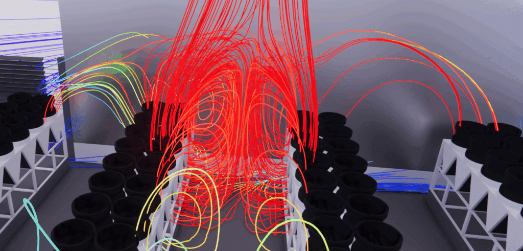 Mithilfe der CFD-Analyse können Sie verstehen, wie mehrere Systeme miteinander interagieren werden . Das folgende Video zeigt die Auswirkungen der Abluft (Wärmefahne) von Generatoren in Verbindung mit Klimaanlagen auf dem Dach.